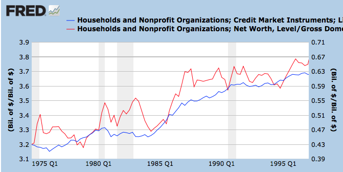 Below is the evolution of Household Debt (blue, right axis) and Net Worth (red, left axis), both as % of GDP during the 1975-1995 period. So I am excluding the last two asset price bubbles to look at a more "normal" period. We still see rising trends for both series. So debt ratios were increasing fast but asset values were growing at an even faster rate, so the net worth kept going up through those 20 years.